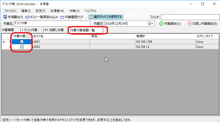 作業対象機器を設定します。「作業対象機器一覧」にシートを切り替えて、対象機器にチェックを入れてください。