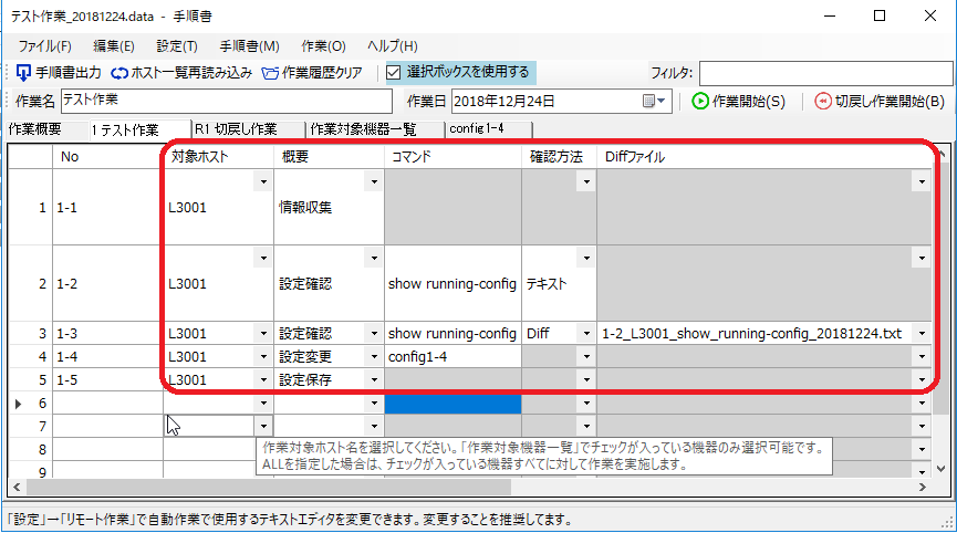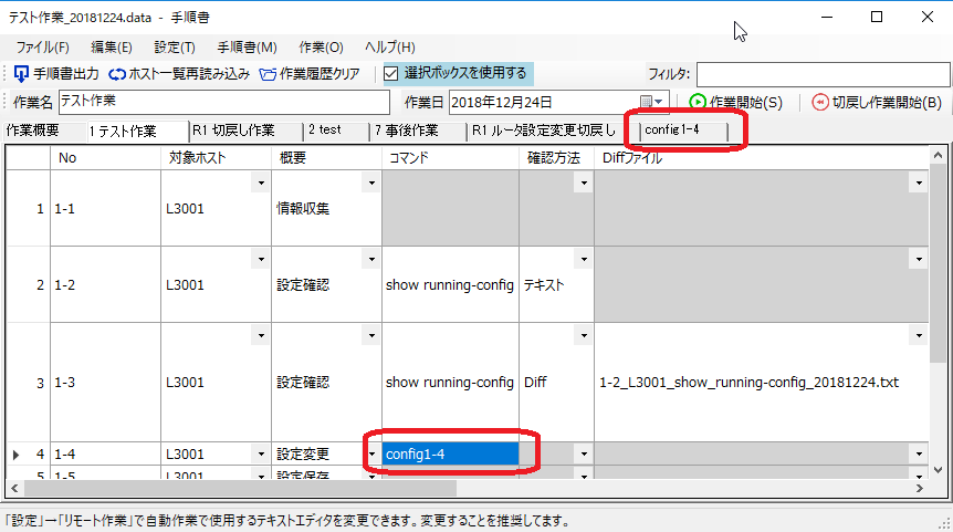「設定変更」・・・「コマンド」列で指定されたコンフィグファイル(別シート)を投入します。