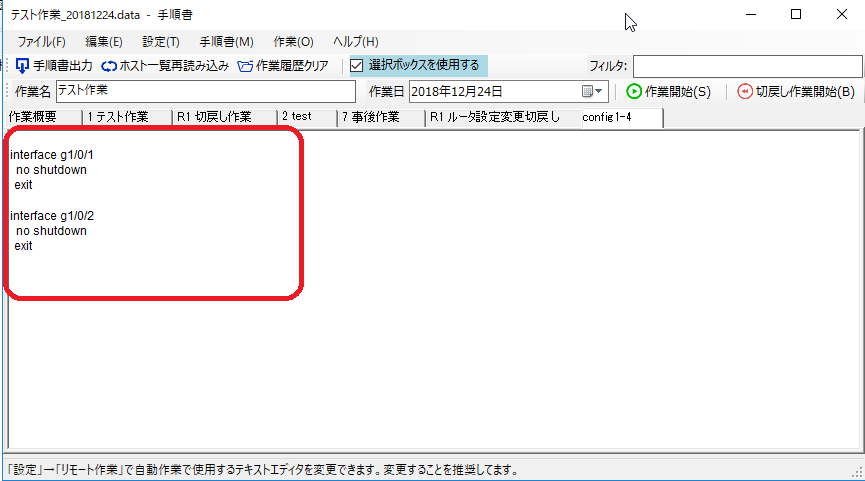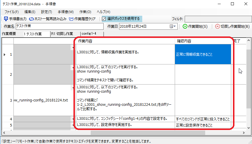 手順書の「作業内容」及び「確認内容」を設定してください。デフォルトで準備した内容が表示されますので、作業に合わせて修正してください。