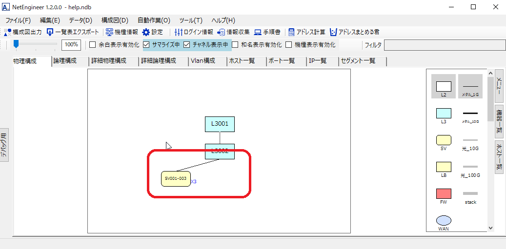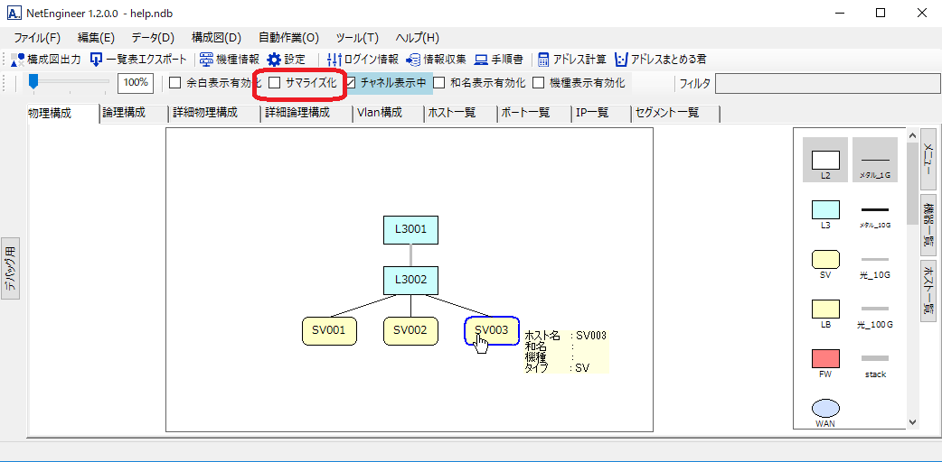 画面上部の「サマライズ化」にチェックを入れてください。同じ種類で同じ接続の機器がサマライズで表示されます。